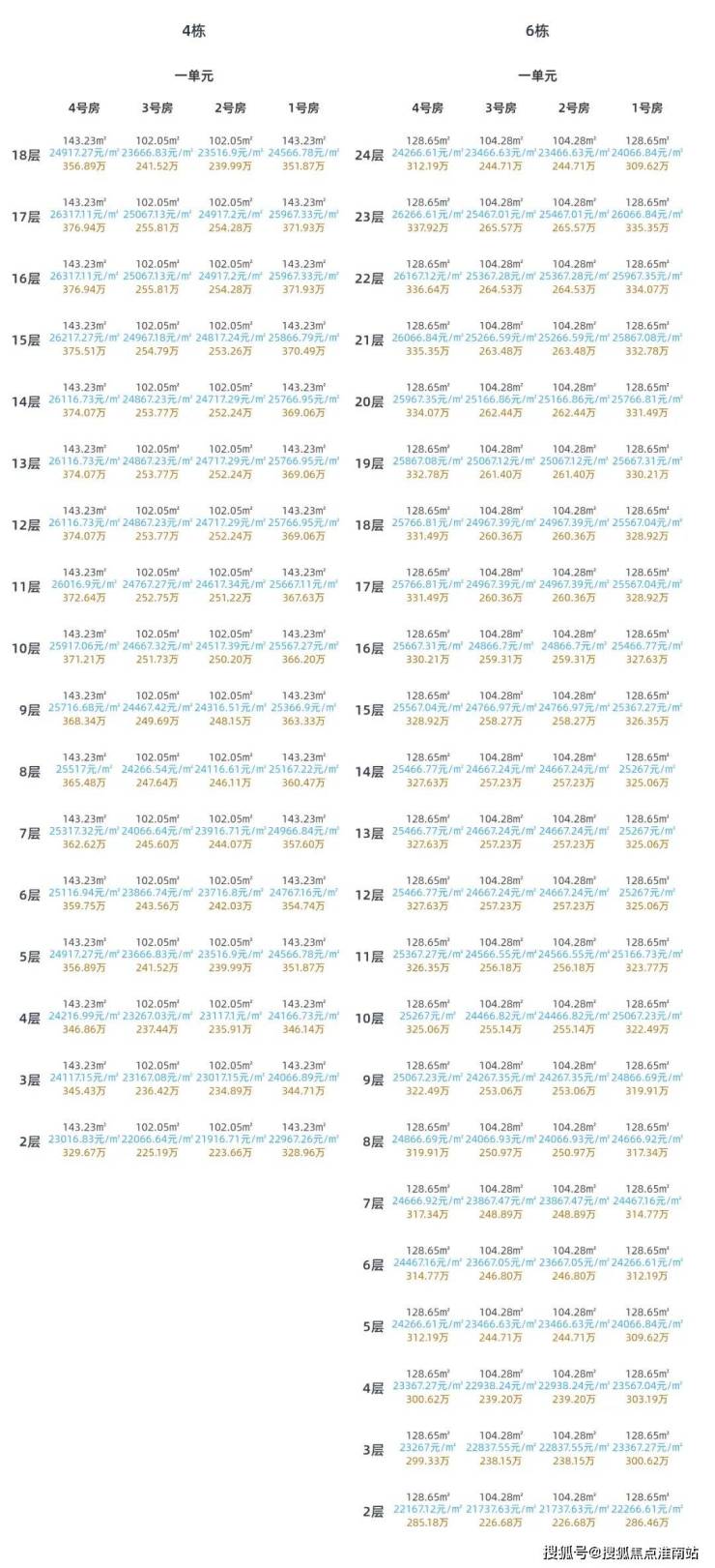 6号楼总层数为24F,总价最高在次顶楼,往下两层之间价差1-3万元不等,12、13、14F价格一致,17、18F价格一致。