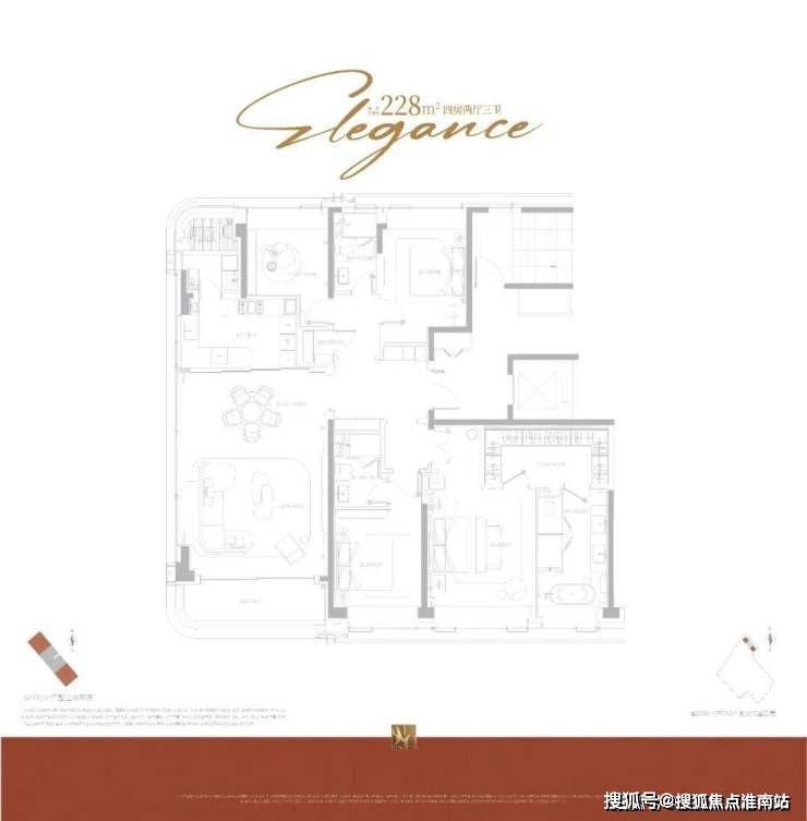 主力户型约228㎡4房两厅三卫 ,面宽达5.6米,配备270°环幕落地窗,客餐厅一体空间约53㎡,主卧套房面积约50㎡(含10㎡衣帽间与15㎡卫浴),完全满足高净值家庭“大空间、强功能”的居住需求。