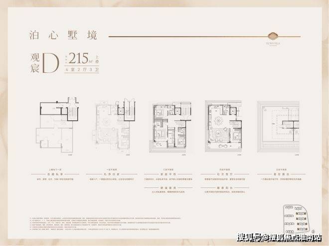 户型特点:上叠将客餐厅置于四楼,顶层露台与客厅、客卧结合,功能协调。卧室在三楼,减少对下叠的噪音影响。主卧带瞰景阳台,采光与视野俱佳。