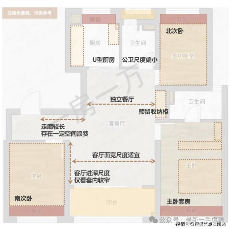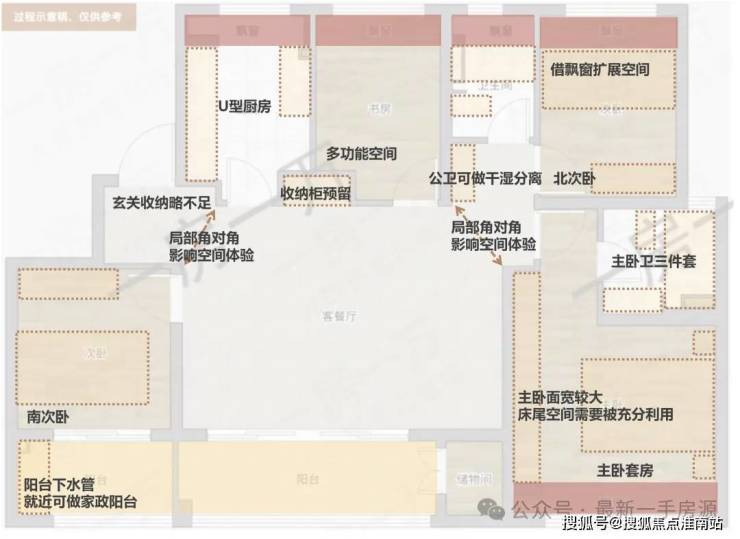 此外,进门玄关,以及客厅东北角均有“角对角”的墙体格局出现,一方面使用感受略有影响,另一方面可能卡住大件家具进出,同样建议实际体验来做决定。