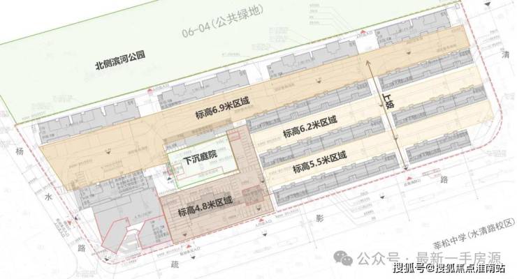 从公示的总图上来看,地块南侧场地标高在4.8米,北侧已经到了6.9米,有2.1米的高差。