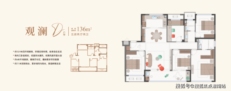 就是下面这个建面约136㎡5房2卫的户型,整个南向面宽,达到了约13.9米,双联阳台的尺寸7.1米,厨房的开间都达到了约4米。