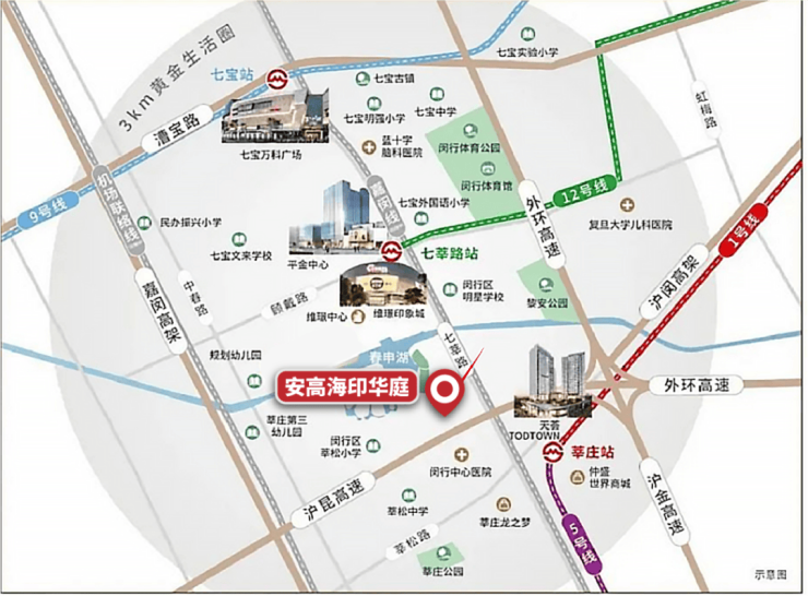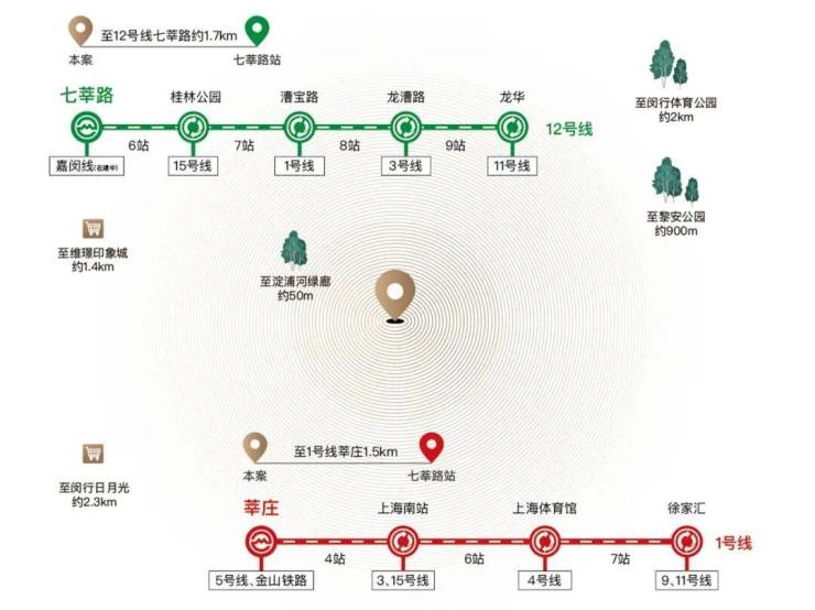 “亚洲第一交通枢纽”:项目周边坐拥双轨交通,凭借12号线和在建嘉闵线在七莘路设站,可以快速通达全城。通过地铁12号线,可直达漕河泾、徐汇滨江、苏河湾、北外滩、杨浦滨江、森兰、金桥等地。
