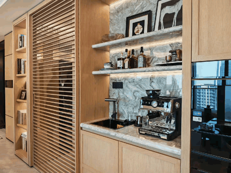 设计细节也非常巧思,比如143平户型里这个木栅,如果去现场你可以手动开合一下,开合分别对应的厨房入口和西厨餐边柜,同时,餐边柜也预留了下水,配置了暖碟抽、直饮水和蒸烤箱。