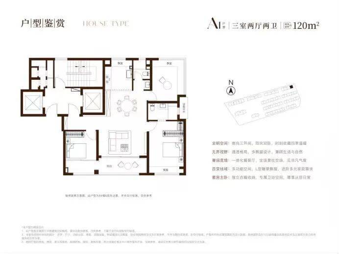 建面约120㎡三房,类一梯一户,户型方正,三开间朝南+南北通透、双联瞰景阳台+主卧飘窗+北卧L型转角飘窗的设计,完全击中了年轻人的“心头好”。