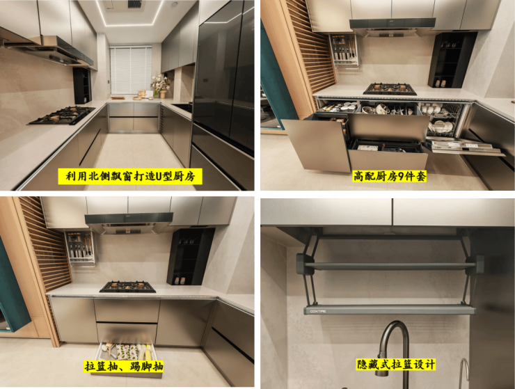 最后是极致的收纳,体现最为亮眼的部分就是厨房,利用北侧飘窗做出U型厨房空间。配备的嘉格纳油烟机、博世洗碗机的排放顺序比较符合人体工学。同时六大超级收纳系统(镂空门板屯菜柜、伸缩拓展平台、电动调味舱、踢脚抽、倾易抽、双层轨道抽)等等细节也进一步丰富整体收纳体系。