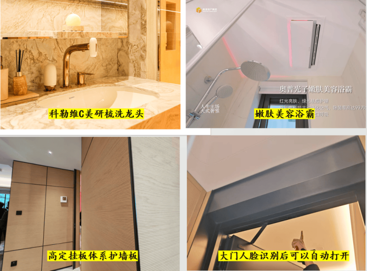 全屋电器&材质配置规格,用嘉格纳2件套、博世5件套、日立空调、AO史密斯热水器规格九件套打底的同时,科勒的维C美研梳洗龙头、奥普光子嫩肤美容浴霸这些概念型产品都在这落地了,另外客厅的保温墙材料、大门的智能设计也都基本顶格处理。