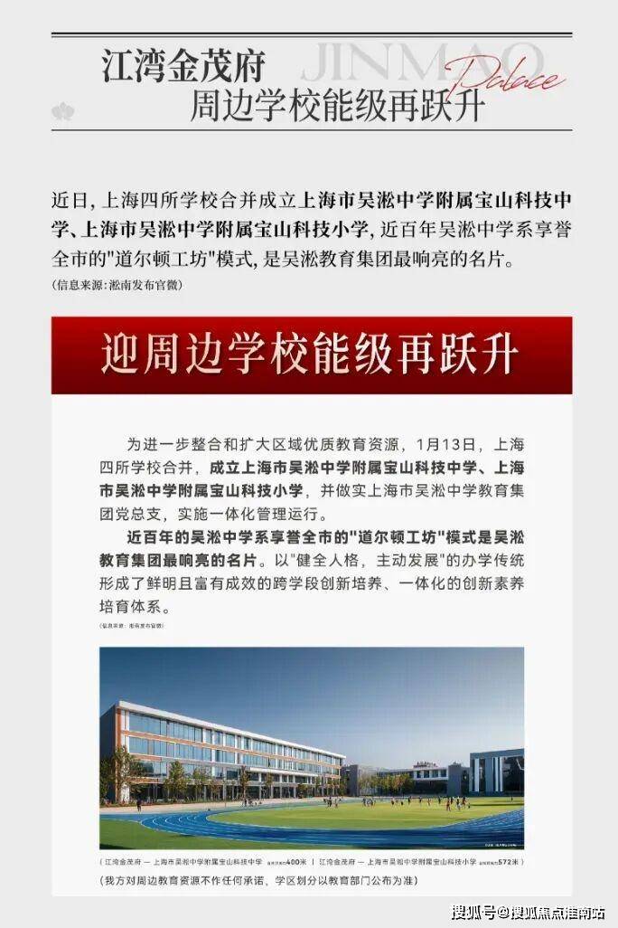 4、优质教育集群,是价值最深厚的“压舱石”当板块内的教育资源通过战略合并与整合实现能级跃升,其带来的不仅是教育选择的优化,更是区域价值的深层加固。优质学校的聚集,始终是资产穿越周期最坚实的保障,为社区提供着持续而稳定的内生动力。上海四所学校合并成上海市吴淞中学附属宝山科技中学、上海市吴淞中学附属宝山科技小学两所重点学校,这将为江湾金茂府的未来价值提供重要支撑。
