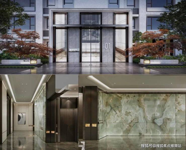 单元门臻选名贵石材搭配香槟金铝板,入户大堂精选翡翠绿岩板,定制3D圆弧吊顶,墙面局部木纹铝板铺贴,辅以透光云石导引,电梯轿门金属蚀刻雕纹,高定精奢入户大堂。