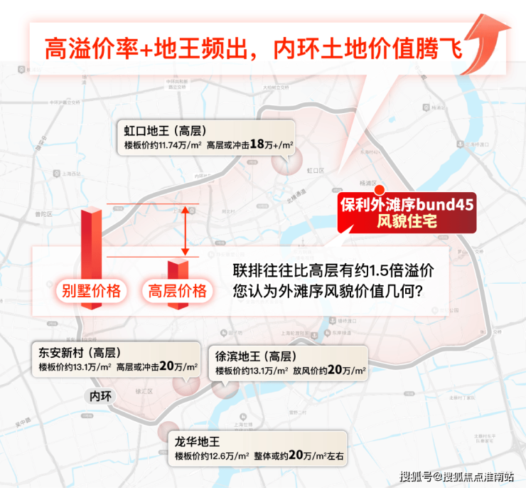 前有绿城徐滨地王放风价约20万/㎡,后有龙华地王,整盘预期或近20万/㎡,紧接着虹口内环又诞生地王,有望冲击18万+/㎡。