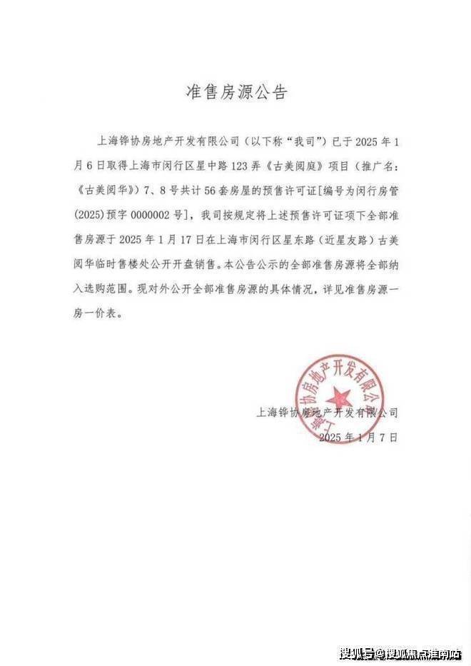 古美阅华三期已过会 本宣传资料为要约邀请,针对项目概况进行介绍,仅供参考不作为销售承诺。项目不排除因政府相关规划、规定及开发商未能控制的原因而发生变化,最终以双方签署的正式《上海市商品房预售合同》及其他相关协议文本为准。项目推广名为"古美阅华",备案名为"古美阅庭",开发公司为上海铧协房地产开发有限公司。本宣传资料发布时间:2025年1月。