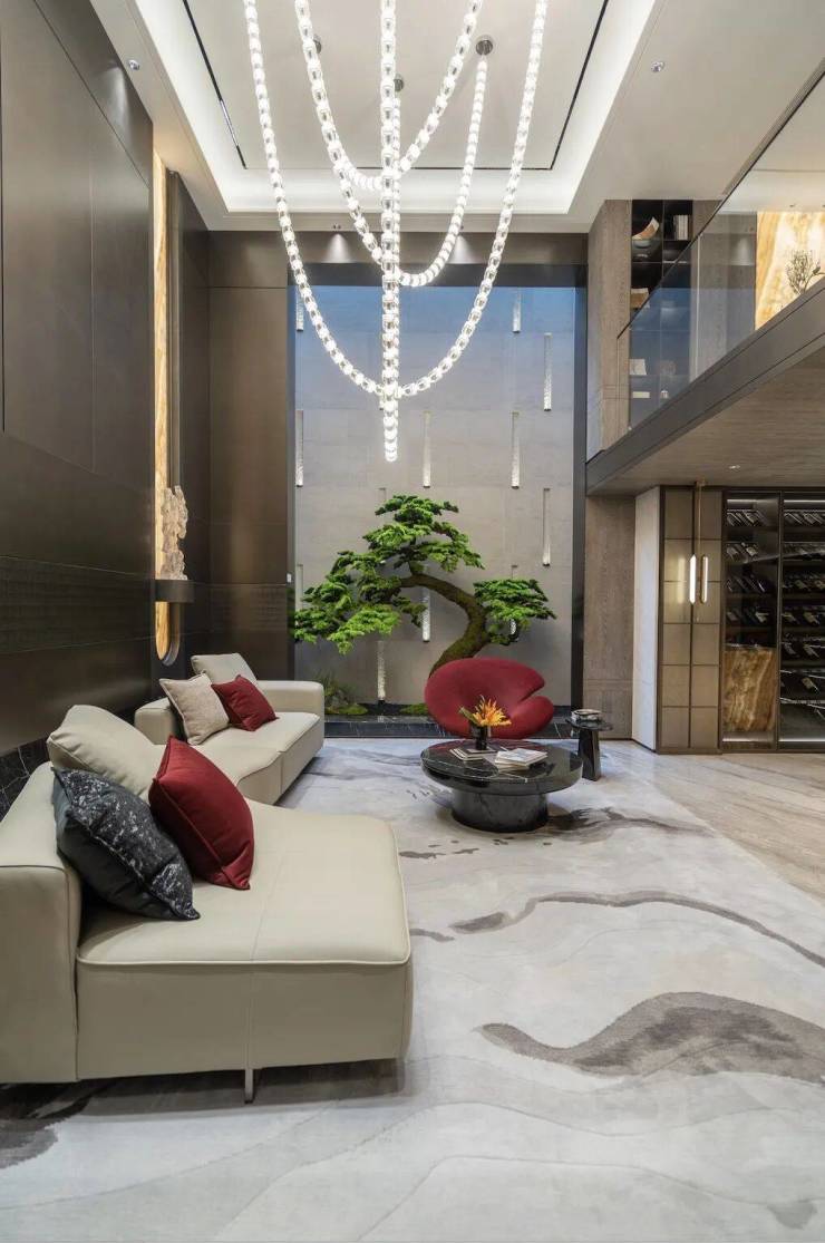 进入泛会所内部,挑高的空间设计,奢华感十足,配合着灯光与艺术品,传达出极具干练的美学主张。
