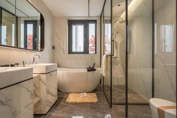 建面约146㎡做到了5开间朝南,大面宽短进深,南向阳台+飘窗面宽达约16.6m,可以做到双厅三房朝南,叠加浴缸、双台盆、休憩区等套房式主卧,这可是200㎡大平层才能达到的尺度。
