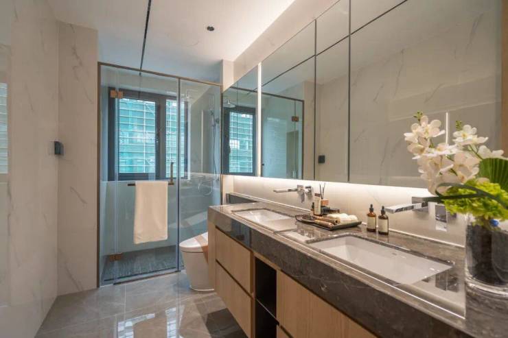 当然还有超级主卧体系。主卧面宽超大,留有浴缸、双台盆、衣帽间等区域,再配约7x2m假日阳台,单是这几项配置让很多叠墅相形见绌,无论是采光通风还是空间的尺度,都无可挑剔。