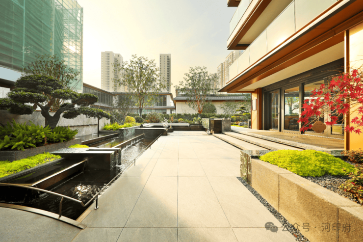 不止飞瀑,实际上在河印府的示范区中,水是贯穿其中的重要元素,从前场到过渡空间再到下沉庭院,或镜面、或溪涧、或叠水,通过不同的形式形成了概念上的「山环水绕」,也是寓意上的好彩头。