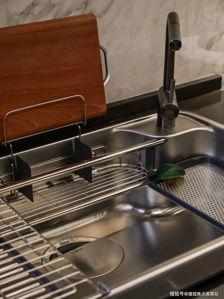 餐边柜配备滨特尔净⽔器+弗兰卡⻰头⽔槽+滑轨插座