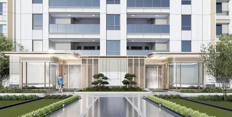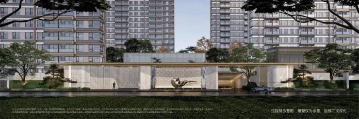 社区入口对标慢奢酒店风格打造,融入高定细节,诸如酒店感仪式门头+环岛式尊崇落客+迎宾式花园设计+精装地库等。