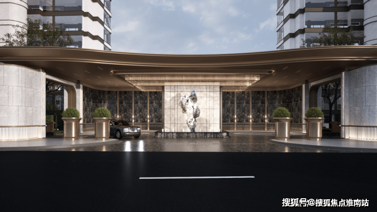 挑高金属雨棚采用极细边,中间凿壁采用 透光奢石,搭配极具 现代主义的雕塑彰显小区档次,背景墙面采用 维多利亚黑大理石,奢华且低调。