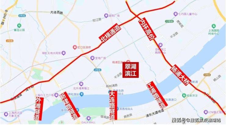 交通方面, 周边1公里内有多条轨道交通,东侧约400米有18号线平凉路站,西侧约700米是4号线杨树浦路站,西北侧1公里为4、12号线大连路站。地块到东外滩滨江的直线距离约580米。