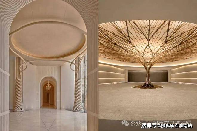 【生辉之金】:香槟金金属流线、手工密拼弧形金属板,外立面石材铝板采用干挂工艺,流动恒久的华贵。