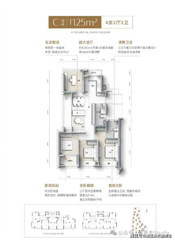 建筑面积125㎡户型,生活交融场域,餐饮厨房三位一体,瞬间升级为“家庭社交核心”。超大竖向客厅,6.25米宽阔尺度,全景落地窗带来IMAX级环幕视觉盛宴。清新卫浴空间,公共卫生间与套间卫生间均采用干湿分离设计,始终保持洁净与清新。家政阳台,紧邻次卧,全卧朝南,三室皆朝南,宽敞面宽达9.3米。套房式主卧,配备全明独立卫浴,预留衣帽间,收纳与休憩得心应手,真正实现阳光满室,平等享受。