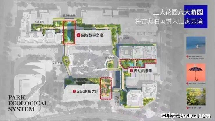 绿宝石花园以莫奈《睡莲》为灵感,打造约30米长的水景花园;林间溪谷则采用椭圆水池设计,汲取克罗耶《斯卡恩的夏日傍晚-海滩散步》的艺术意境,营造水景与休憩空间的交互体验;城市露台位于6号楼下,面向中兴公园,异域植物环绕的阶梯提供从高向低的景观视野,塑造城市与自然的层次感.