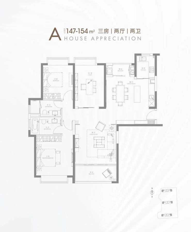 建面约147-154㎡三房两厅两卫