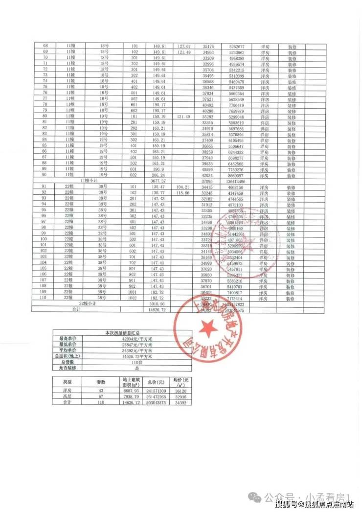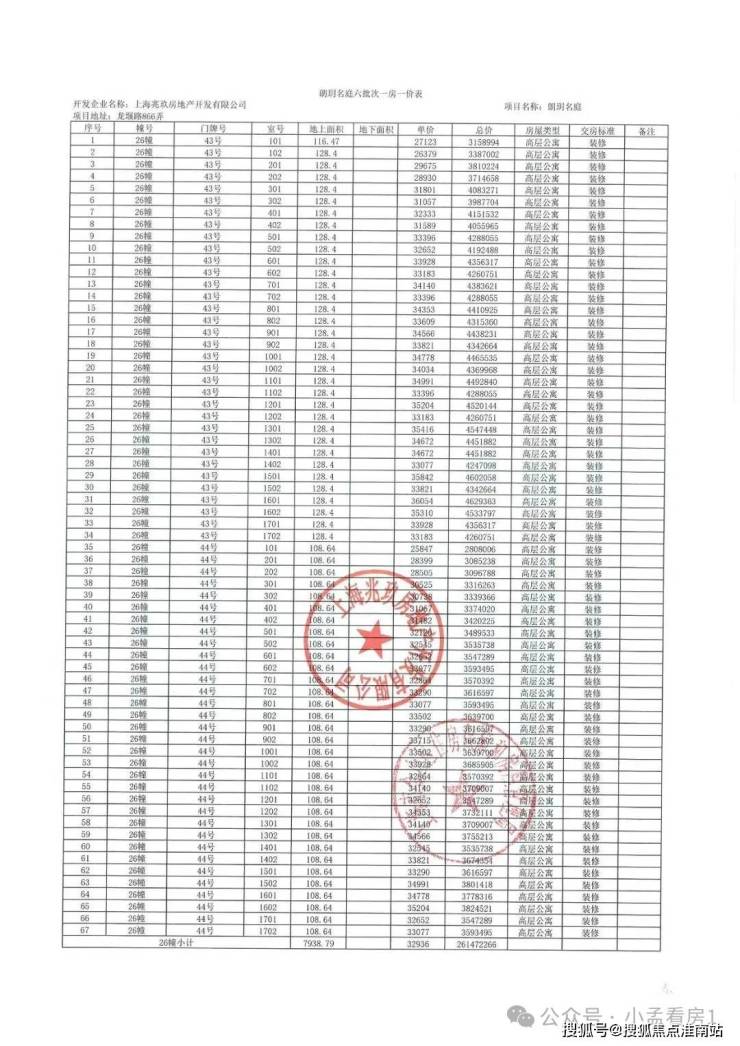 一房一价表: