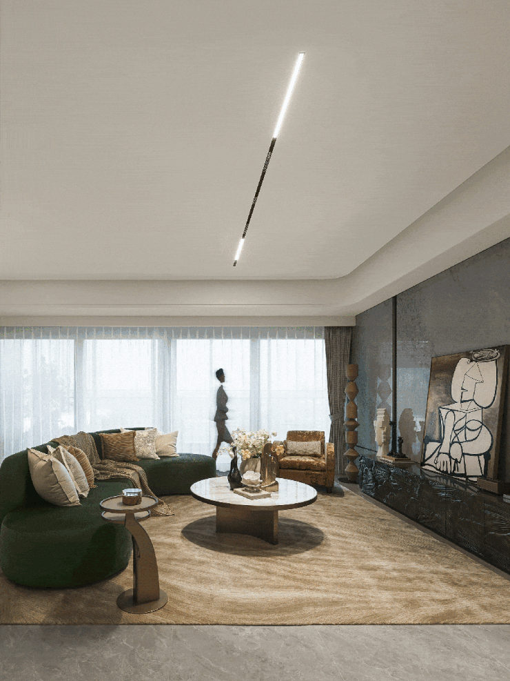 项目还融合了五星级酒店的精工标准,金属踢脚线、无主灯系统、防溢卫浴等,每一处细节都彰显着品质与格调。这种品质,不是通过堆砌豪华材料实现的,而是渗透在空间的每一个细节里。