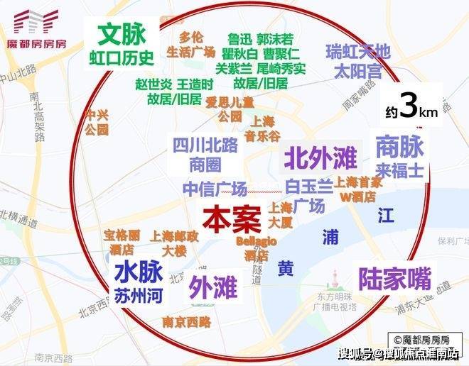 拥有大量文化建筑、名人故居:如上海邮政大楼、上海大厦、多伦路文化名人街、溧阳路洋房群、鲁迅、郭沫若故居等稀缺文化资源,就是它的文脉;而白玉兰广场、和隔街相望的“双子塔建筑”来福士、四川北路商圈、及18万㎡的商业航母级瑞虹新城太阳宫等地标性商业,则构成了它的商脉;再加上地处黄浦江与苏州河交汇处 ,上海的一江一河做它的水脉。