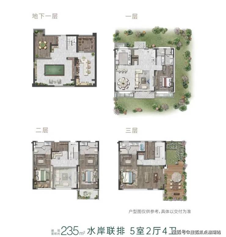项目推出最后66套建面约205/235㎡实景联排,整体地上三层+庭前绿地+地下室的空间结构。