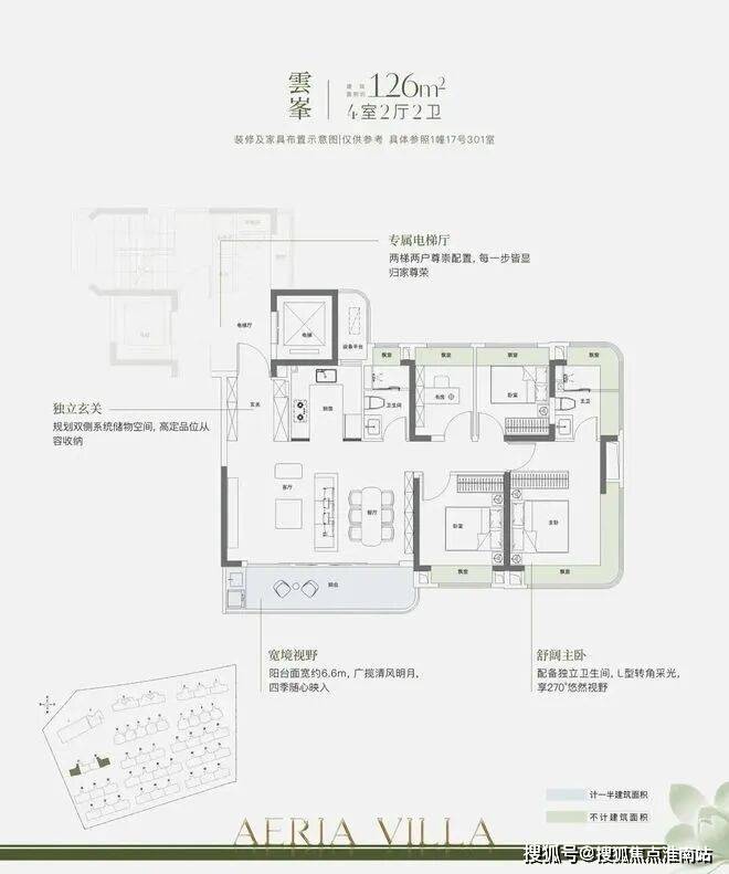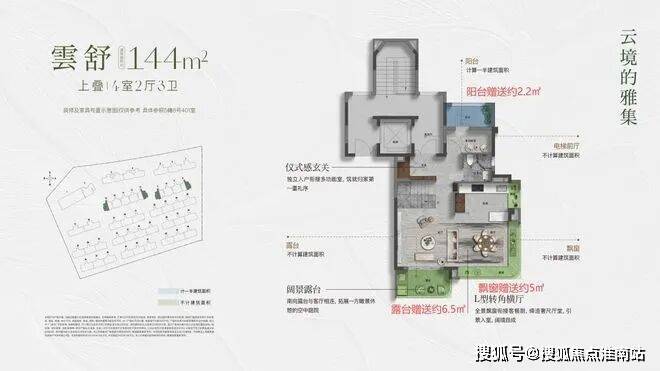 约144㎡上叠,入户独立梯厅,带来更好的功能利用和私密性。