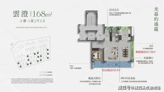 约168㎡上叠;这个户型同样独立电梯厅,但是三面宽设计,南向三阳台空间并列。