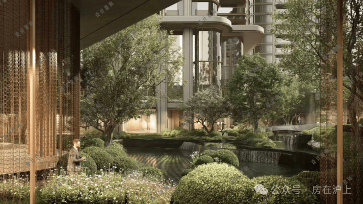 三层归家动线: 从地面景观层到架空层,再到入户层,穿越绿植、光影与水景,步步进入私域。