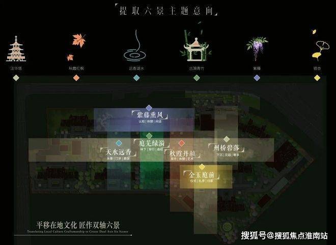 建筑们围合出的中心花园中,州桥老街、秋霞圃、远香湖、古猗园、紫藤园、银杏古树等嘉定6景被南山地产提炼、转译,形成了具有在地文化特色的6大景观主题空间。