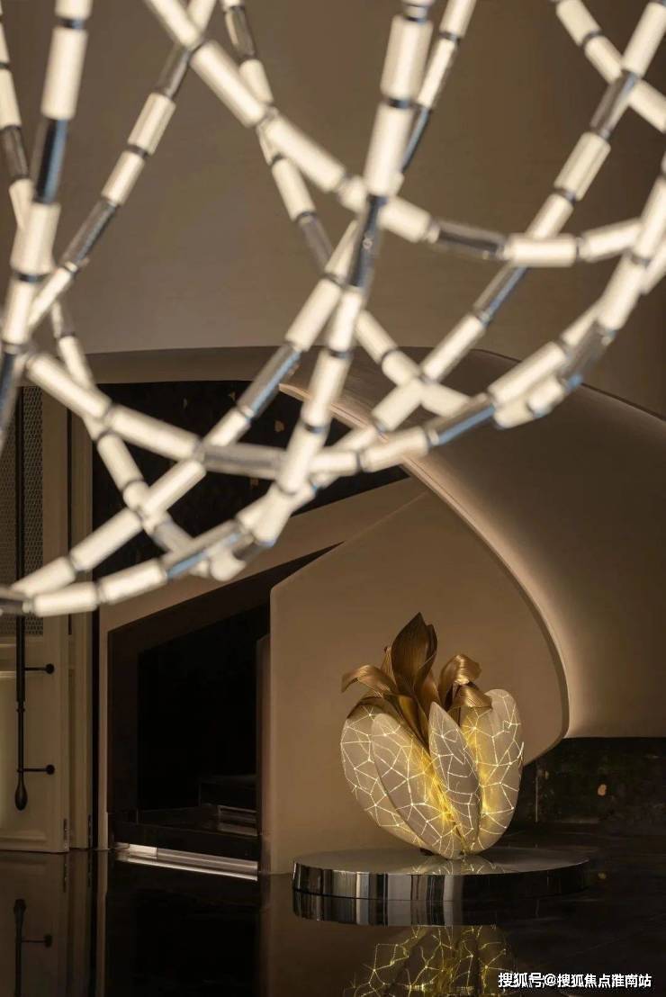 经纬交织,月映千年。绛丝工艺被应用于空间的吊灯之中,设计师力图通过非遗传统,不生硬地创建时间与空间的相对关系,突破经典设计中对于历史的平铺直叙。