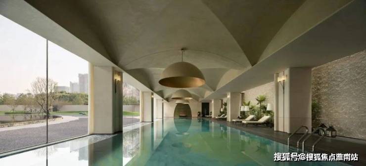 泳池在几何关系中得到了构建,层层叠叠的拱形吊顶拼接,对侧的落地窗映射室外的开阔景观,石质的肌理进行还原表达,分别从视觉与触感上映射自然主义。