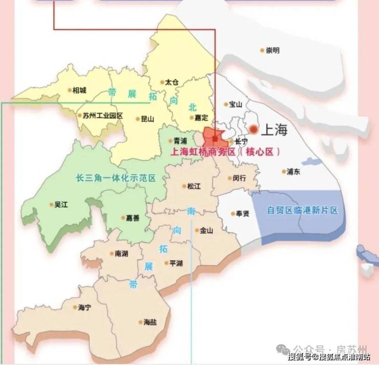 “两带”是以虹桥商务区为起点延伸的北向拓展带和南向拓展带。其中,北向拓展带重点打造中央商务协作区、国际贸易协同发展区、综合交通枢纽功能拓展区。