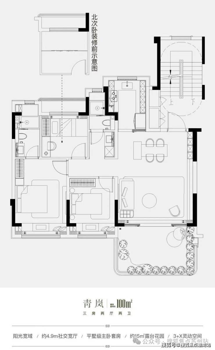 青岚户型 建筑面积约100㎡ 三房两厅两卫阳光宽域|约4.9m社交宽厅|平墅级主卧套房|约15㎡露台花园|3+X灵动空间