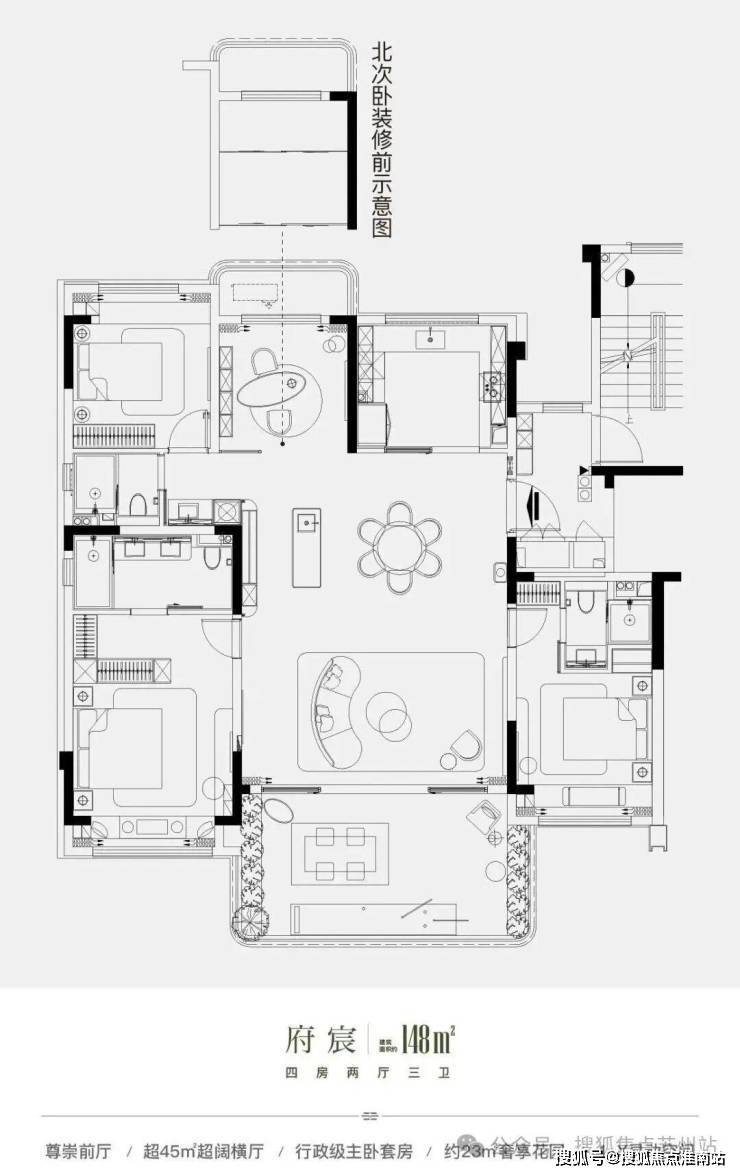 府宸户型建筑面积约148㎡ 四房两厅三卫尊崇前厅|超45㎡超阔横厅|行政级主卧套房|约23㎡奢享花园|4+X灵动空间✅中铁·青云府售楼处电话:400-891-9910✅︎✅︎✅✅苏州中铁·青云府营销中心热线400-891-9910(官方预约看房热线)
