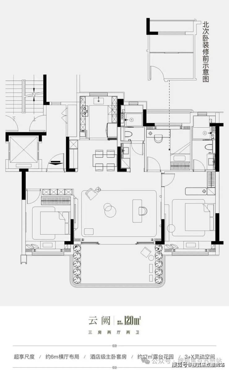 云阙户型建筑面积约120㎡ 三✅中铁·青云府售楼处电话:400-891-9910✅︎✅︎✅✅苏州中铁·青云府营销中心热线400-891-9910(官方预约看房热线)房两厅两卫超享尺度|约6m横厅布局|酒店级主卧套房|约17㎡露台花园|3+X灵动空间