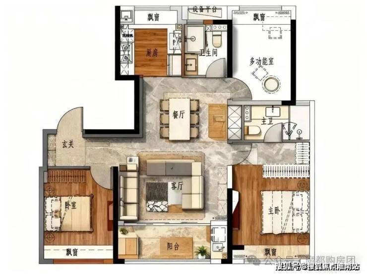 全卧带飘窗,其中北房间(多功能室)和南次卧的飘窗无墙,进一步拓展了空间利用率,可根据需求改造成书房、儿童房或休闲区等。主卧配备独立主卫,保障了主人的隐私与便利;南次卧和另一个卧室也能满足家人或客人的居住需求。
