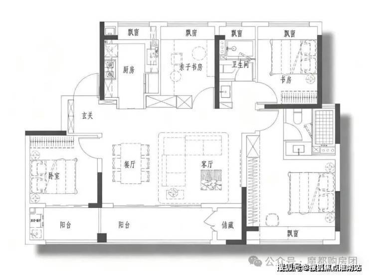 三开间朝南,搭配多处飘窗和阳台,能充分引入自然光线,使室内空间明亮通透,同时也能带来较好的景观视野。