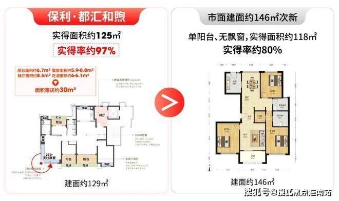 洋房标准层边套赠送面积约30㎡,实得率高达97%,相当于直接赠送约200多万价值,常规项目80%的实得率与之相比差距明显,该户型实际可享受常规155-160㎡的空间尺度。