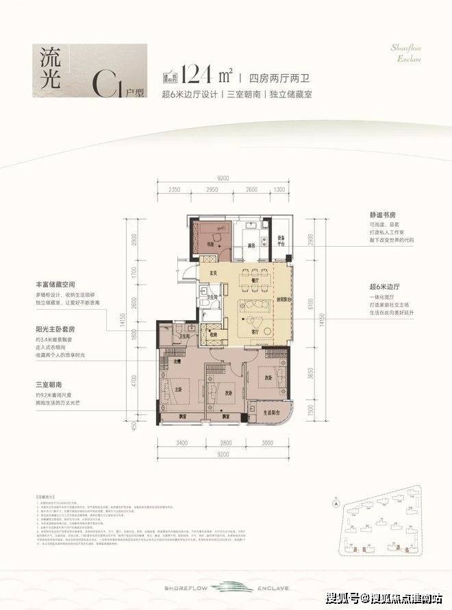 主力户型:106㎡、120㎡、124㎡、139㎡,部分楼栋两梯四户设计。