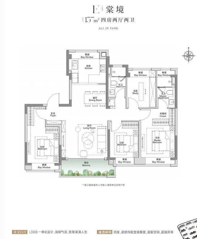 上海宝山金茂棠前售楼处电话:400-8818-994(开发商统一认证)建面约105㎡3房2厅2卫,做到了三开间朝南4个飘窗+双面阳台系统+主卧套房设计+270°转角飘窗,该户型的居住体验、舒适度、尺度感,是同级别产品所无法比拟的。