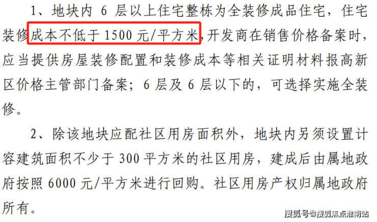 根据地块出让要求,6F以上为全装修,装修标准不低于1500元/㎡。其中6F及以下的也可以选择全装修。