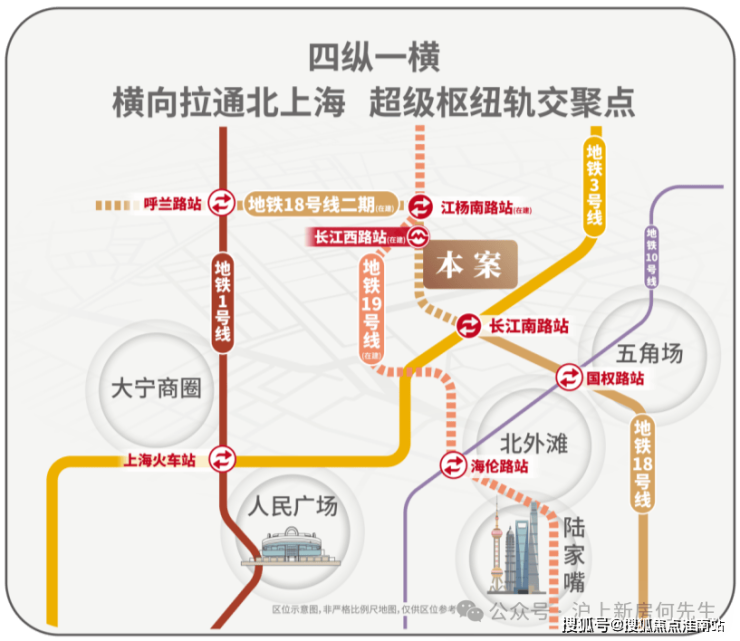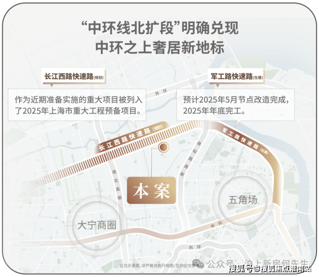 交通方面:项目紧邻长江西路地铁站(直线距离约150米),1站江杨南路,5站复旦,7站五角场。中环线北扩段明确兑现,军工路快速路25年开工,长江西路快速路列入上海市重大工程清单预备项目,快速链通城心,随着中环线北扩段的政策明确,淞南将正式进入中环时间。未来经逸仙高架,进入南北高架、内环高架、中环高架,可快速链通南北上海。