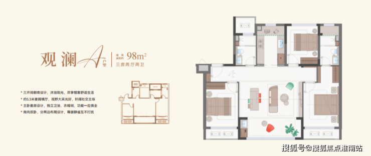 建面约98㎡的户型,整体是一个三房两卫的布局,除了三开间两卧朝南、套房主卧这些基础配置之外,个人认为这个户型比较值得称道的有2个: