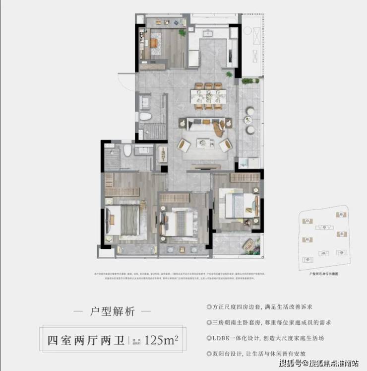125㎡四房两卫同样是边套:三个卧室均排列在南侧,充分实现了“阳光平权”,每个家庭都可以沐浴在阳光中醒来。LDBK一体化的公区,充分实现了家庭成员间的互动;除了边厅外接的阳台外,南向次卧同样设计了阳台,兼顾了景观和晾晒的需求。